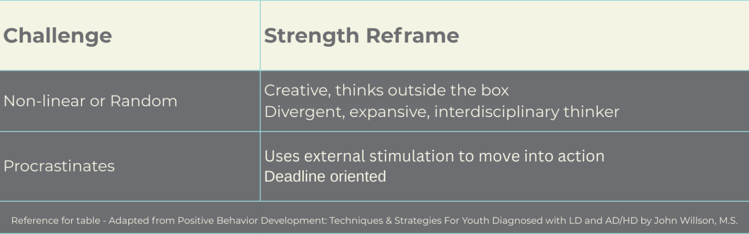 1. Identify your strengths – for every challenge you see as an ADHDer, try to reframe it as a strength. Reframing allows a supportive emotional response to a perceived misgiving. Here’s an example to get you started: